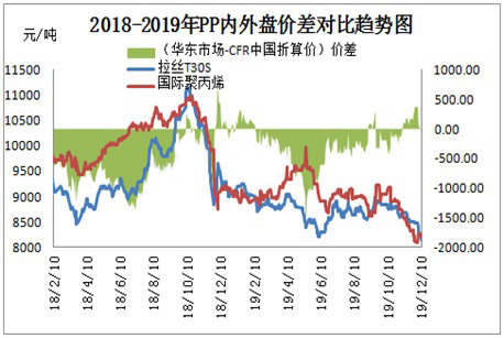 ????????由2019年PP內外盤價差對比發現,12月份市場內外盤價格開始逐步扭轉局勢,主因目前國際聚丙烯裝置多套開車并不順利,如馬來西亞石油公司裂解裝置問題及俄羅斯西布爾裝置前期開車均出現短期不順利現象,同時西方國家面臨新年節日,多數生產企業開工負荷下降,導致國內到港資源偏緊。而國內市場因產能急劇上升及終端訂單跟進乏力制約,國內市場低價不斷頻現,從而內外盤價差逐步逆轉。