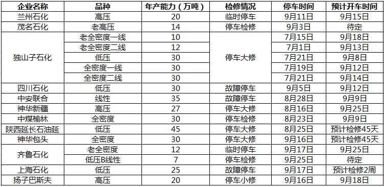 ????????9月份國內PE裝置檢修較上月稍有減少,PE共計損失量16.8萬噸。月內神華包頭全密度裝置、延能化低壓裝置大修,茂名石化老高壓停車檢修、上海石化低壓裝置故障停車目前仍未重啟。神華新疆高壓裝置、獨山子石化全套PE裝置、中安聯合線性裝置、中煤榆林全密度裝置開車,揚子巴斯夫、蘭州石化高壓裝置、四川石化低壓裝置月內短暫停車目前均已經重啟。整體來看,9月中下旬部分石化檢修裝置陸續重啟,國內PE供應較前期緩慢增加。