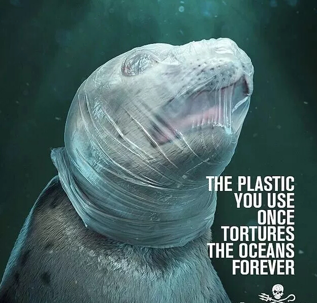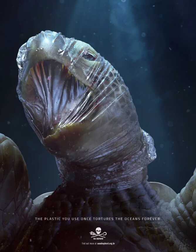 ????????今年4月國際非盈利環保組織海洋守護者(Sea Shepherd)發布了一組令人不寒而栗的海報。在海報中,無論是海龜還是海豹,都被海洋中漂浮的塑料袋緊緊包裹著頭部,而它們幾乎要窒息的樣子,讓很多人看了深感震驚、心痛,甚至是恐懼。