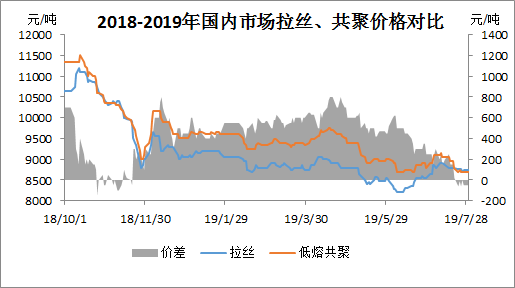 ????????進入7月份以來,隨著PP期貨的大幅拉漲,作為標品的PP拉絲跟漲迅速,作為非標品的共聚,漲幅跟進較為緩慢,國內聚丙烯現貨市場拉絲與共聚市場價格出現平水的現象,從2016年至今拉絲與共聚平水的現象僅出現過兩次,目前已經進入倒掛態勢,拉絲價格高出共聚300元/噸之多。