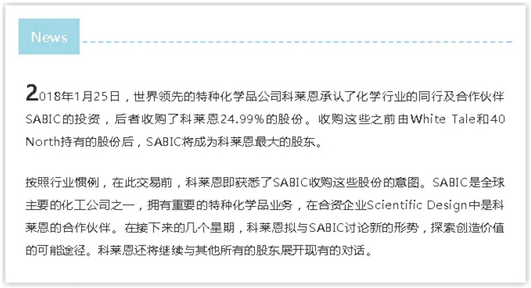 ????????一些分析師表示,在科萊恩上周宣布其首席執行官退出、今年上半年虧損并擱置了與SABIC的合資計劃后,擁有科萊恩25%股權的SABIC可能會考慮接管該公司。