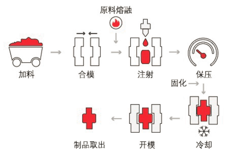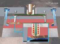 3.在柱塞或螺桿的加壓下物料被壓縮并向前移動,通過機筒前的射嘴以很快的速度注入較低溫度的閉合模腔內;