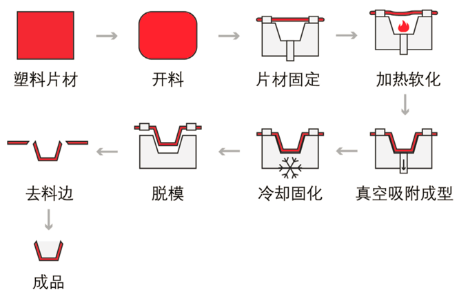 一種塑料加工工藝,主要原理是將平展的塑料硬片材加熱變軟后,采用真空吸附于模具表面,冷卻后成型,并應用于各行各業的一種技術工藝。