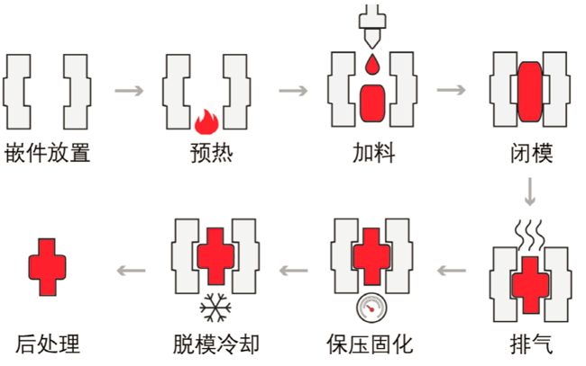 主要用于熱固性塑料制品的生產。成型經過加熱使其熔化,加壓沖模,再經過加熱交聯固化,脫模后既得制品。