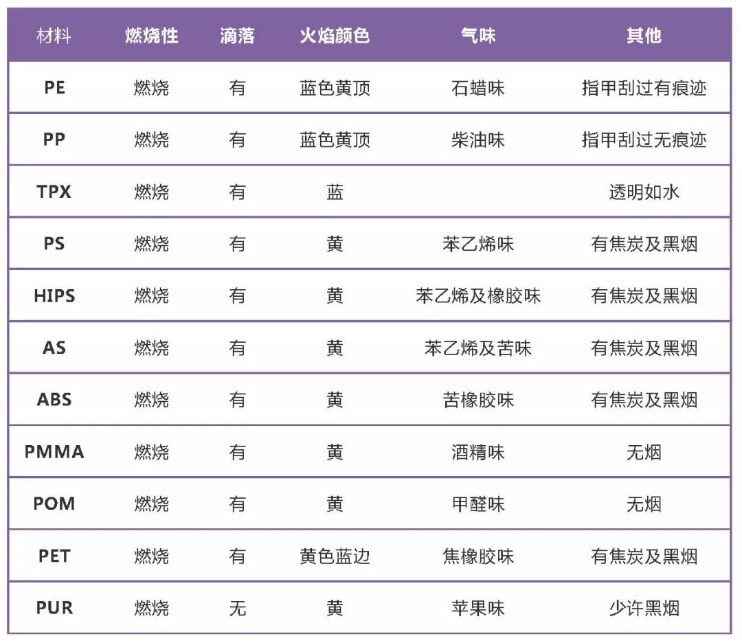 對于普通的塑料品種利用燃燒方法即可比較準確鑒別。燃燒時的火焰顏色、氣味以及離火后的狀態等可以作為鑒別的根據。