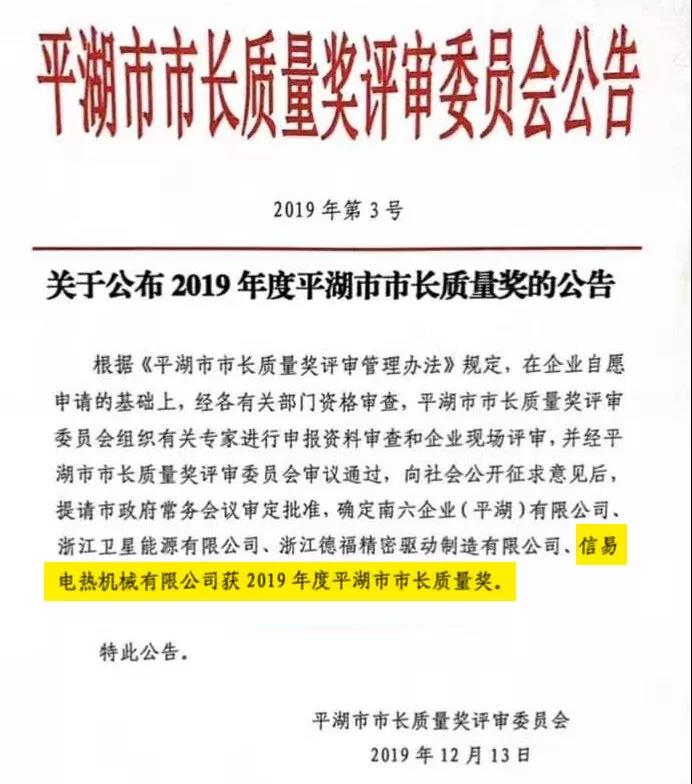 平湖市市長質(zhì)量獎(jiǎng)是平湖市人民政府設(shè)立的最高質(zhì)量獎(jiǎng)項(xiàng),由平湖市政府表彰和獎(jiǎng)勵(lì),每年度評審一次,每屆不超過5個(gè)。該獎(jiǎng)項(xiàng)旨在發(fā)揮市長質(zhì)量獎(jiǎng)的導(dǎo)向作用,推動企業(yè)實(shí)施卓越績效模式和先進(jìn)質(zhì)量管理方法,深入開展質(zhì)量管理創(chuàng)新、質(zhì)量強(qiáng)企創(chuàng)建活動,樹立質(zhì)量標(biāo)桿,加強(qiáng)典型示范,加快推進(jìn)質(zhì)量強(qiáng)市建設(shè),促進(jìn)經(jīng)濟(jì)轉(zhuǎn)型升級。平湖信易2019年度獲此殊榮,深感榮幸,同時(shí)亦感到責(zé)任之深重,今后信易將繼續(xù)在精益管理,保證質(zhì)量,做好品牌等方面努力進(jìn)取,追求卓越,為塑膠輔機(jī)行業(yè)做出更大的貢獻(xiàn)。