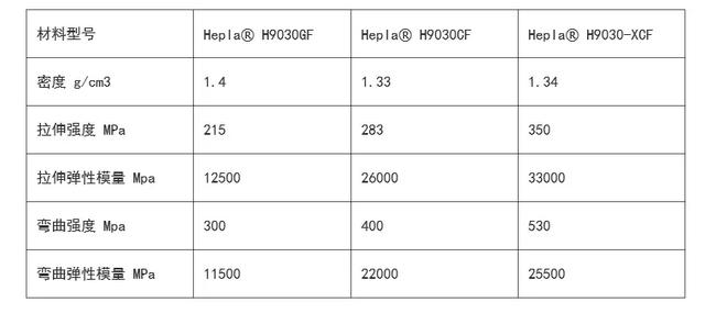 該產品具有優異的機械強度與抗沖擊能力,尺寸穩定性高、翹曲低,材料性能較進口產品提升30%。以高溫尼龍為基材的Hepla? H9000-XCF系列碳纖維復合材料,彎曲剛度超過52GPa,彎曲強度高達520MPa,拉伸強度達到360MPa;以PA66為基材的Hepla? H7200-XCF系列拉伸強度達到315MPa。 采用新產品生產的零部件比鋼制零部件輕75%,比鋁合金部件輕40%,可替代大部分金屬,從而為汽車輕量化及其它行業“以塑代鋼”提供更好的解決方案。
