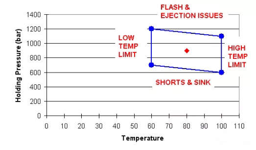 ????????成型視窗是非常重要的一個(gè)測(cè)試。通常這個(gè)外觀成型視窗是由保壓和料溫(無定形料)、保壓和模溫(結(jié)晶料)構(gòu)成。