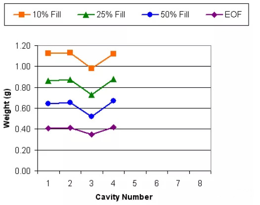 ????????只有多穴的情況下才會(huì)需要做這個(gè)測(cè)試,比如2穴或者多穴。目的是檢查在不同的充填階段,各穴之間的最大偏差百分比。