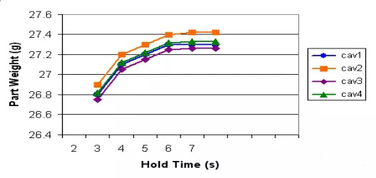 對(duì)冷流道模具或者半冷流道(熱轉(zhuǎn)冷),為保證模與模之間的可重復(fù)性,保壓壓力一定要持續(xù)到澆口完全冷卻。????????曲線生成以后, 選擇一個(gè)產(chǎn)品重量穩(wěn)定以后的時(shí)間。在上圖中,產(chǎn)品重量在7s后就不再增加,所以為安全起見同時(shí)彌補(bǔ)工藝本身的波動(dòng), 保壓時(shí)間要設(shè)定為8s。