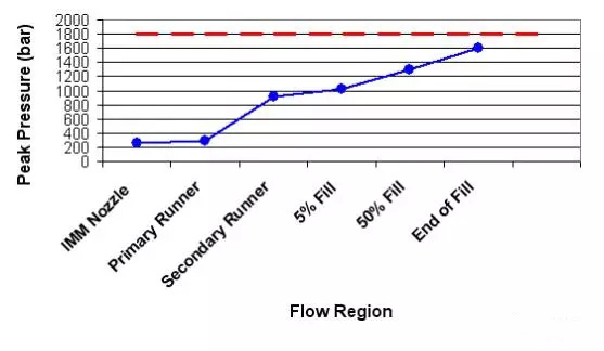 做壓力降測(cè)試的目的是評(píng)估充填不同階段壓力的損失狀況。這通常包括機(jī)臺(tái)射嘴、豎流道、主流道、次流道、澆口和充填末端。