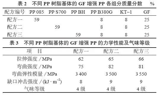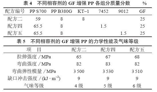 ????????可以看出,無論PP基體是粉料還是粒料,不同配方材料的氣味等級均為4 級。由此推測在GF增強PP體系中,氣味的最根本來源在于相容劑PP-g-MAH。