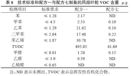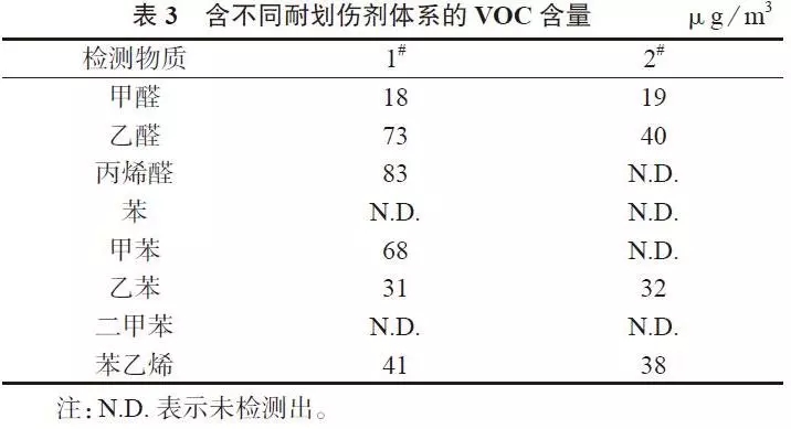 ????????1# 和2# 所散發(fā)的總揮發(fā)性有機化合物(TVOC) 含量分別為18.47 μgC/g和14.16 μgC/g,兩個體系的TVOC含量均滿足要求( 低于50 μgC/g)。但從表中可以看出,2#在氣味等級和VOC方面總體上均低于1#。
