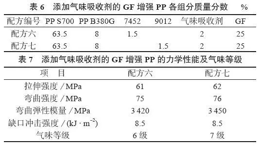????????添加氣味吸收劑之后,材料的力學性能有所下降,但下降幅度較小,而氣味等級均比原來提高一個等級。