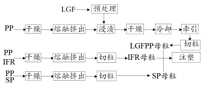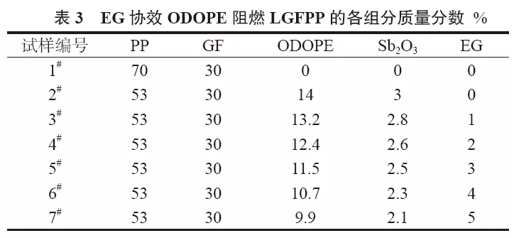 ????????將PP,ODOPE,Sb2O3,EG按一定的比例加入到高速混合機中,均勻混合后加入到雙螺桿擠出機中(溫度250℃,螺桿轉速300r/min),經過熔融共混,熔體進入LGF浸漬模具(溫度設定260℃),LGF經過分散、充分浸漬,經口模牽引拉出、水冷、風干、造粒,得到阻燃LGFPP顆粒, 然后注塑成試樣。