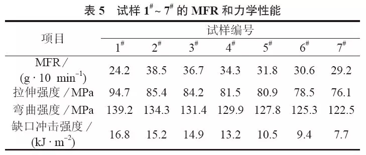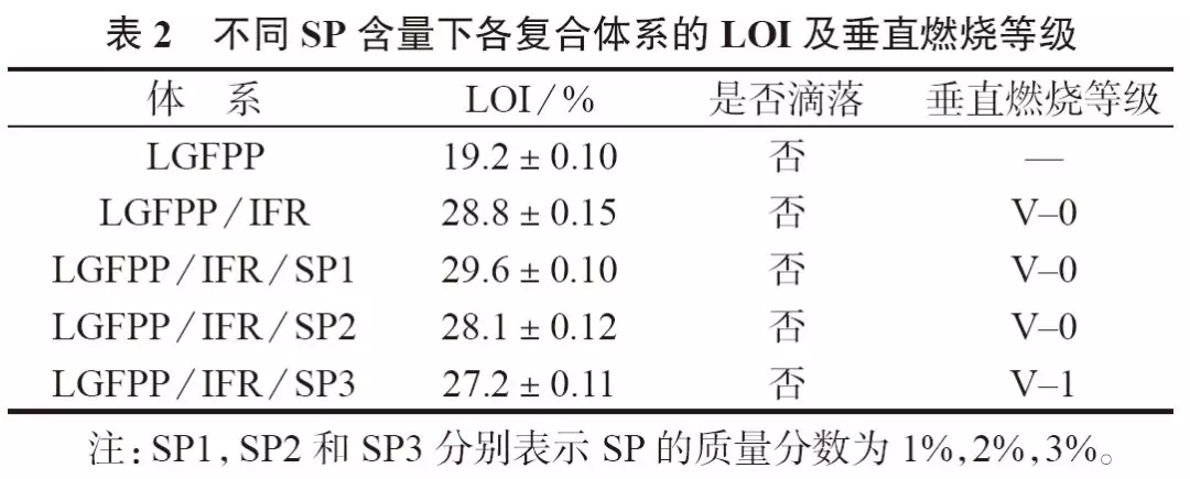 ????????加入IFR后復合體系的力學性能有所下降,再加入SP后力學性能進一步下降。SP質量分數為1%的體系力學性能相對較高,其拉伸、彎曲強度和缺口沖擊強度相對于LGFPP/IFR阻燃復合體系分別下降了20.46%,12.06%和10.65%,下降幅度相對較小。?