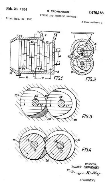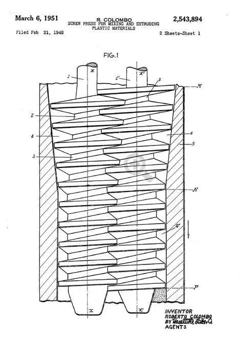 Colombo Roberto在美國(guó)申請(qǐng)的一系列專(zhuān)利中的一篇——screw press for mixing and extruding plastic materials(1951)