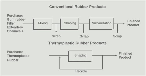 熱塑性彈性體可以反復加工的特點,決定了它優(yōu)于熱固性橡膠的主要優(yōu)越性。兩者在加工方面的其它關(guān)鍵性區(qū)別如下表所示。
