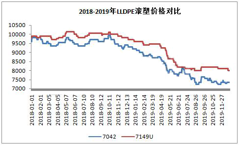 ????????從圖中顯示,2018-2019年國內滾塑料價格明顯高于普通線性,且價格差距逐步擴大,2019年較普通線性高50-850元/噸。目前國內聚烯烴行業產能過剩,國內石化一直致力于高端產品研發,搶占高端領域,以獲取較大利潤。從線性區域來看,由于產能過剩,7042價格近兩年一直處于下行通道,削減了石化利潤。線性行業,近年來,研發主要方向集中在C8線性,茂金屬、滾塑料等,其中滾塑料做為一個分支,近年研發較多。