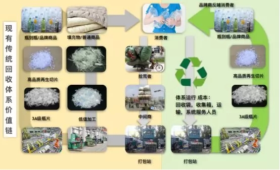 ????????在舊的PET價(jià)值鏈中,PET回收、分選和打包站,都是靠拾荒人群,沒有環(huán)保成本和對(duì)工人的保護(hù),物流效率低下,瓶片賣到化纖企業(yè),再生產(chǎn)品沒有很高附加值。而現(xiàn)在這種模式已經(jīng)難以為繼,品牌企業(yè)的加入,對(duì)于高品質(zhì)可追溯PET瓶的要求,城市垃圾分類,環(huán)保執(zhí)法,致使拾荒人群逐步消失,取而代之的是高品質(zhì)回收體系,回收+互聯(lián)模式的構(gòu)建,同時(shí)這也增加了回收系統(tǒng)的成本。用再靠賣給化纖工廠這些方式已經(jīng)不能的低端低值應(yīng)用,無法維持PET的價(jià)值鏈。