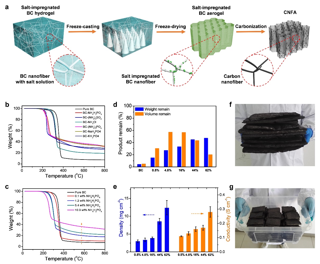????????圖1、宏觀尺寸CNFAs的合成。(a)CNFAs制造工藝示意圖;(b)純BC和BC浸漬NH4H2PO4、(NH4)2SO4、NH4Cl、(NH4)3PO4、NaH2PO4或KH2PO4的TG曲線;(c)純BC和BC浸漬不同濃度NH4H2PO4后的TG曲線;(d)以純BC和BC為原料,在800°C下加入不同量的NH4H2PO4炭化制備CNFAs(NH4H2PO4的重量比分別為0.5、4.8、16、44和62 wt%);(e)1200 ℃下制備的CNFAs的密度和導電性;(f ~g)在800℃下制備的CNFAs照片,展示了其可以大規模制備。