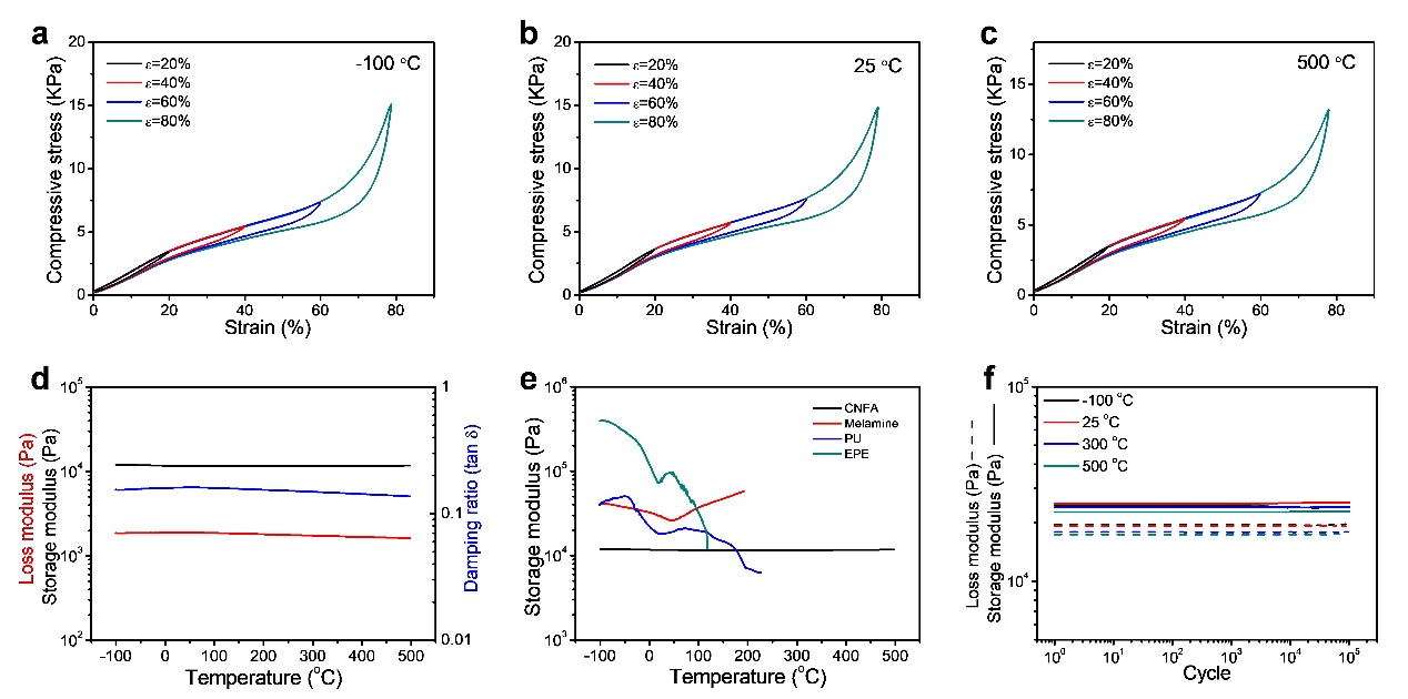 ????????圖2、CNFAs在T = -100~500℃時N2中的熱力學穩定的力學性能。(a~c)形變為20%、40%、60%和80%時CNFAs的壓縮應力-應變曲線,溫度分別為:a)-100 °C、b)25 °C和c)500 °C;(d)CNFAs在T = -100-500℃時的粘彈性(儲存模量、損耗模量和阻尼比);(e)CNFA、三聚氰胺、PU和EPE泡沫的儲存模量隨溫度的變化;(f)不同溫度下CNFAs在1×105次循環中的儲存模量和損耗模量。