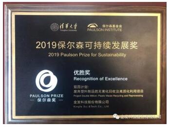 ????????其中,金發科技申報的“雙百計劃:廢棄塑料制品的無害化回收及高質化利用項目”項目,從100多個創新解決方案中脫穎而出,榮獲2019保爾森可持續發展獎優勝獎,是保爾森獎設立以來第一個得獎的材料類項目。