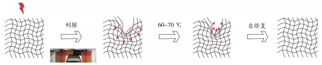 ????????保險杠清漆需具有優異的外觀、耐化學品以及耐候性,以保護保險杠不受外界氣候、紫外傷害、化學品侵蝕以及物理或洗車時的刮蹭,此外還需與基材有良好的匹配性。目前絕大部分的保險杠清漆都是雙組分聚氨酯涂料體系。雙組分聚氨酯可以通過原材料的選擇搭配,匹配保險杠基材的韌性,并且在80℃的低溫烘烤下,依然能滿足流平均勻、高光澤、高飽滿度、以及耐候耐化學品的要求。另外,優化過的雙組分聚氨酯清漆具有明顯的自修復功能,即使被刮傷后也能自修復到原有的高光澤外觀。最通常使用的雙組分聚氨酯涂料就是通過異氰酸酯基團(—NCO)和主樹脂中的活性羥基(—OH)反應來交聯,從而達到優異的漆膜性能。使用脂肪族多異氰酸酯的聚氨酯體系,具備優異的耐候性;雙組分聚氨酯交聯后形成的氨酯鍵能夠耐多種化學品;氨酯鍵之間還能形成氫鍵,使漆膜硬且柔韌,具有抗石擊、耐刮擦甚至自修復等功能;而這些功能都是汽車涂料所要求的。圖9為聚氨酯涂膜的自修復過程示意圖。