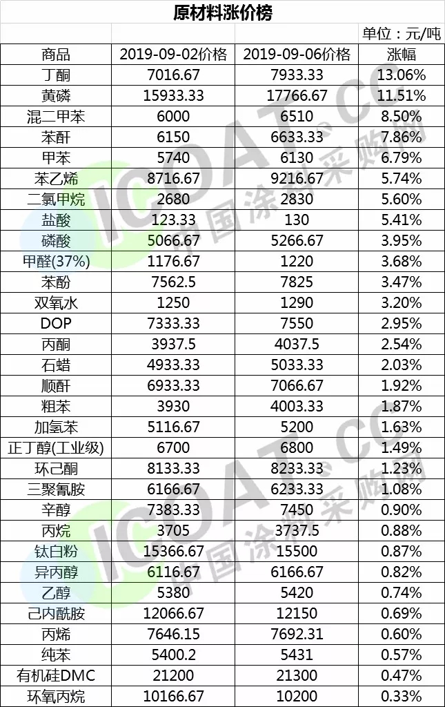 ????????在短短一周內(nèi),就有幾十種原材料價(jià)格呈現(xiàn)上漲趨勢(shì),丁酮價(jià)格由7016.67元/噸漲至7933.33元/噸,漲幅為13.06%,位居漲價(jià)榜榜首。黃磷價(jià)格從15933.33元/噸漲至17766.67元/噸,漲幅為11.51%,混二甲苯價(jià)格由6000元/噸漲至6510元/噸,漲幅為8.50%,分別位居漲價(jià)榜第二名和第三名。