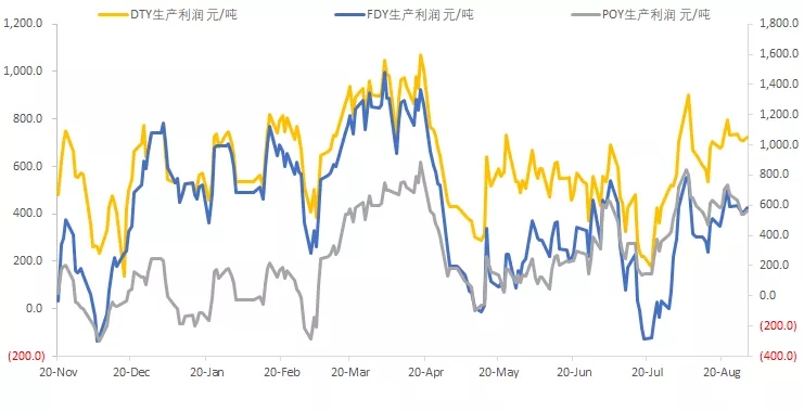 ????????最近聚酯產業(yè)鏈下游利潤和開工率齊升,說明終端對聚酯的需求還不錯,上游讓渡的利潤也盤活了下游企業(yè)。長絲的產銷最近也有所回升,8月份平均產銷率為83%,基本上與去年同期持平,反觀7月份的平均產銷率只有55%,8月份下游真的是有很大起色,但是上游PTA毫無起色。