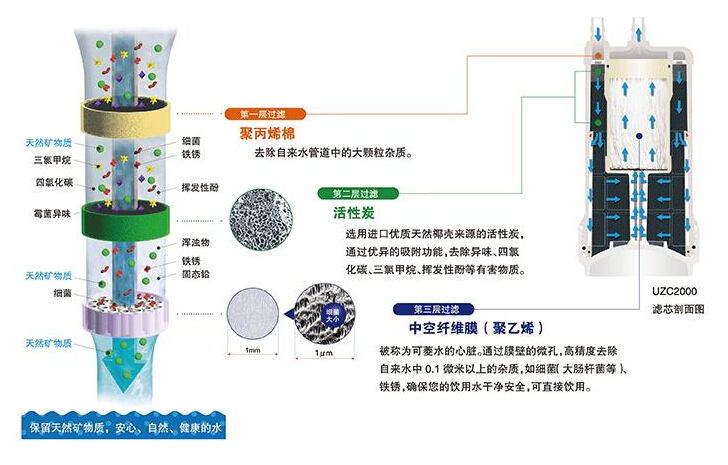 ????????通過聚丙烯棉、活性炭及中空纖維膜組成的三層過濾系統(tǒng),過濾后保留天然礦物質(zhì),為用家?guī)戆残?、自然、健康的飲用水?/p>