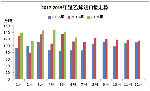 ????????據統計,2019年上半年PE進口總量在813.1萬噸,較去年同期(694.1萬噸)增加119萬噸,增幅在17.14%。2019年PE進口量仍處于增加走勢,主要原因是19年國外PE裝置擴能更甚于國內,且國外PE輕烴裝置較多,聚乙烯成本較低,利潤可觀,使得聚乙烯更具價格優勢。