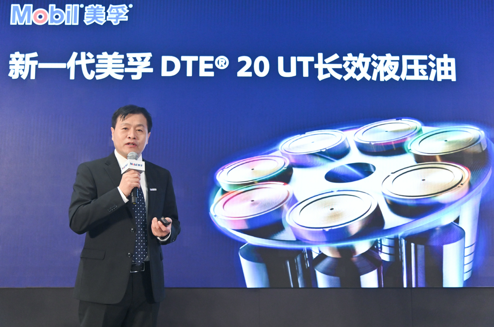 埃克森美孚(中國)投資有限公司北亞潤滑油業務總工程師陳思軒先生在發布會上介紹美孚DTE? 20 UT長效液壓油系列產品的特性