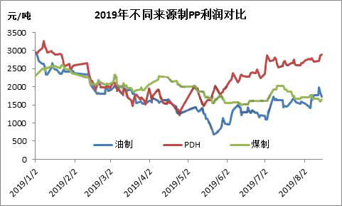 ????????此次東華能源計劃投產(chǎn)的裝置,繼續(xù)采用PDH工藝,為何近幾年來PDH裝置如雨后春筍般,蜂擁而至?首先從終端產(chǎn)品利潤來看。以聚丙烯為例,2019年丙烷脫氫制聚丙烯平均利潤在2000元/噸以上,下半年以來,因為丙烷價格震蕩下行,跌幅遠大于聚丙烯價格跌幅,生產(chǎn)企業(yè)利潤好轉。丙烷脫氫制聚丙烯利潤明顯好于煤制和油制利潤。