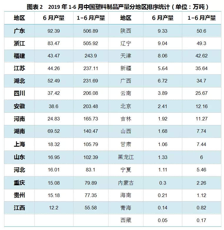 ????????1-6月塑料制品累計產量排名前五位(廣東、浙江、福建、江蘇和湖北)的總產量達到1725.51萬噸,占到全國總產量53.3%。(按6月規模企業統計)