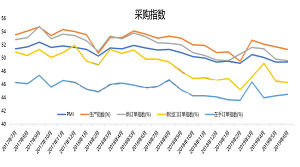 ????????值得注意的是,隨著中美貿(mào)易戰(zhàn)的不斷升級,市場信心指數(shù)嚴重受損。PMI指數(shù)已經(jīng)連續(xù)兩個月在榮枯分界線以下,這表明當前經(jīng)濟下行壓力不容小覷。新訂單指數(shù)連續(xù)兩個月在下降,一直是在榮枯分界線以下,這也說明企業(yè)整體訂單的情況不好,尤其新出口訂單是出現(xiàn)明顯下滑,上半年出口訂單受趕出口影響出現(xiàn)反彈,但下半年出口會出現(xiàn)回落。外部環(huán)境導(dǎo)致的外需下滑,以及它給整個經(jīng)濟增長帶來的壓力,是不容低估的。