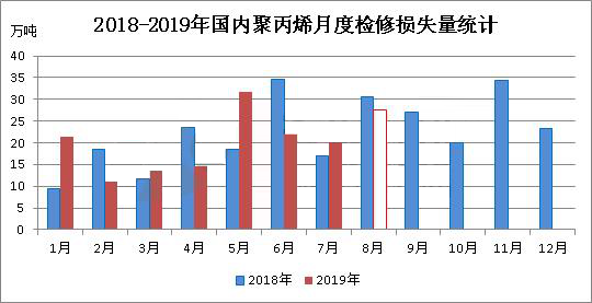 ????????2019年8月份,國(guó)內(nèi)聚丙烯檢修損失量預(yù)計(jì)在27.63萬噸,環(huán)比(2019年7月份20.12萬噸)增加7.51萬噸,增幅在37.33%;同比(2018年8月30.66萬噸)減少3.03萬噸,減少9.9%。2019年1-8月份,預(yù)計(jì)累積檢修損失量為162.15萬噸,較去年同期(2018年1-8月164.11萬噸)略有減少,降幅1.2%。