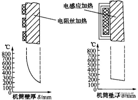 圖1 電阻加熱器和感應(yīng)加熱器加熱機(jī)筒時的溫度梯度